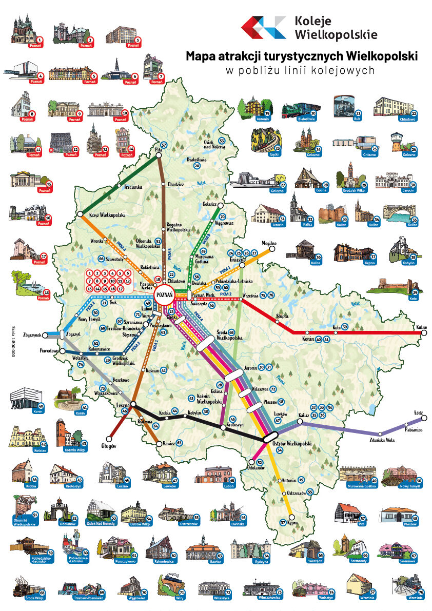 Przedstawiamy Państwu mapę atrakcji turystycznych Wielkopolski zlokalizowanych w pobliżu 17 linii kolejowych KW. Mapa przybliża 76 obiektów historycznych położonych w obrębie 1-3 km od stacji kolejowej. Staraliśmy się zaprezentować najciekawsze „perełki” Wielkopolski dostępne już dziś dla każdego kolejowego podróżnika. Prezentujemy także Instytucje Kultury, z którymi współpracujemy, oferujące specjalne korzyści dla osób podróżujących ze Wspólnym Bilecie Samorządowym. Wierzymy, iż wyjazdy z mapą znacznie ułatwią planowanie, a następnie poznawanie różnorodnych i ciekawych zakątków Wielkopolski.